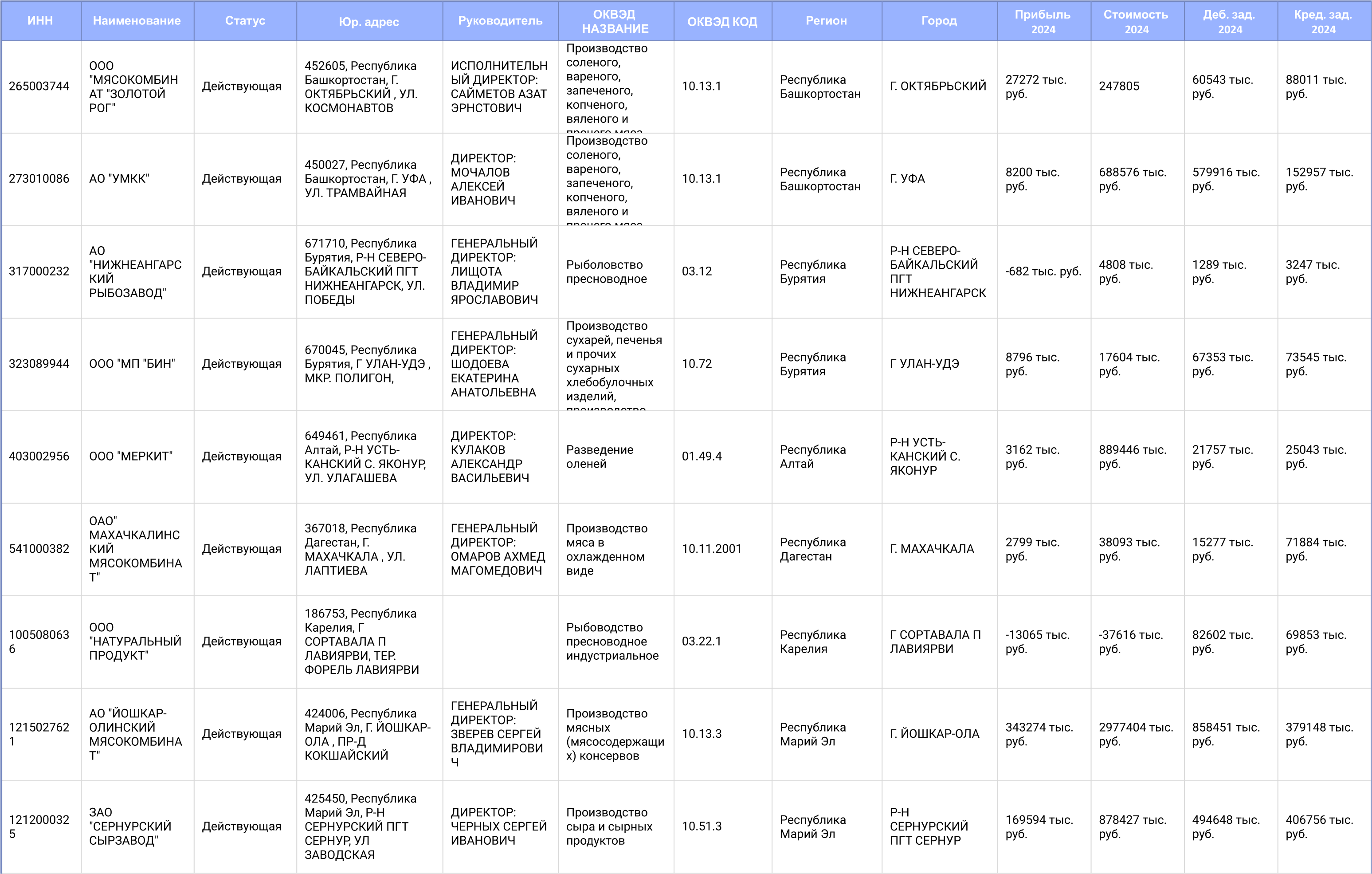 Построение целевых списков для холодных звонков и рассылок, сегментация компаний по продукции, региону и выручке для повышения конверсии, выявление всех производителей конкретной продукции