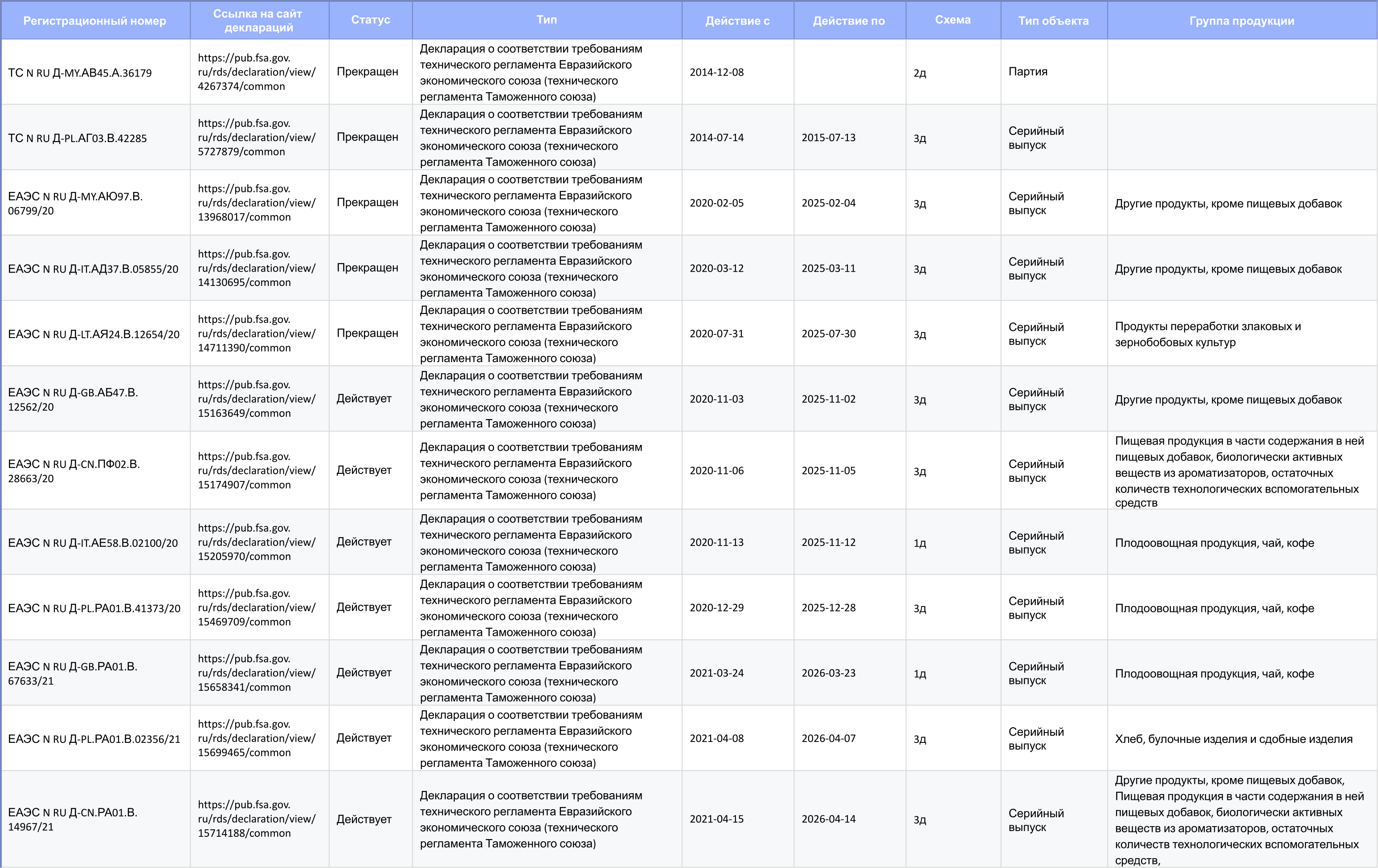 Федеральная служба по аккредитации — данные о задекларированной продукции